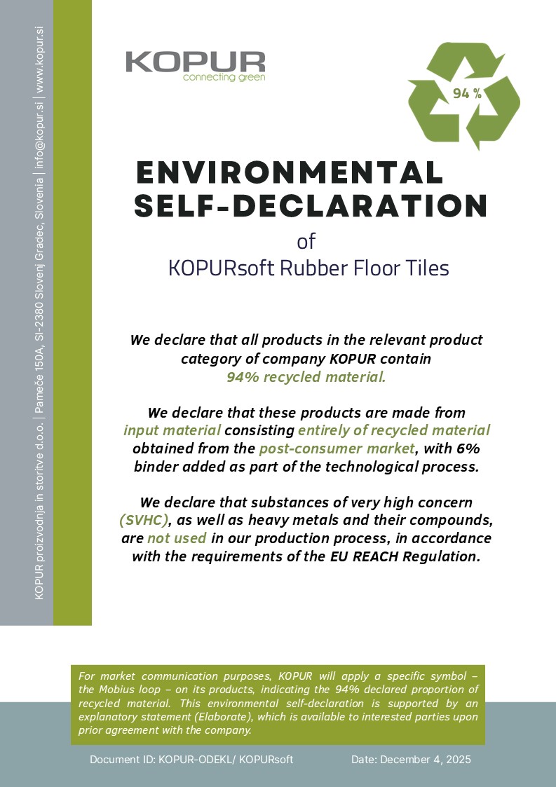 94 % der Zusammensetzung der KOPURsoft Fallschutzplatten bestehen aus recyceltem Gummigranulat aus Post-Consumer-Abfällen. Der deklarierte Anteil an recyceltem Material wurde von einer unabhängigen Drittstelle gemäß den Anforderungen der ISO 14021 bestätigt und belegt die Zuverlässigkeit, Rückverfolgbarkeit, Überprüfbarkeit und Glaubwürdigkeit der entsprechenden Umweltaussage.